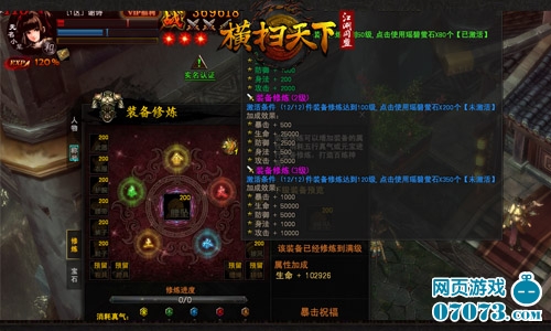 暗黑江湖,内炼身心,外修法器,双管齐下才能在江湖站稳脚跟。内炼身心,是修炼人物角色身上的装备找寻提升战力的方法。暗黑武侠双端网游《横扫天下》将提升装备修炼等级,并增加神级套装,双重加强,战力成倍增长!