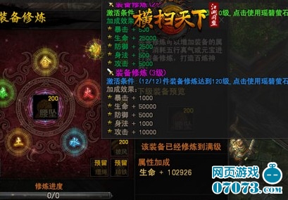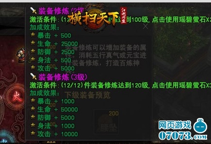 第三级,激活条件需12件装备修炼达到120级,再消耗350个瑶碧萤石,即可获得暴击1000、生命50000、防御5000、身法1000、攻击10000的属性加成。