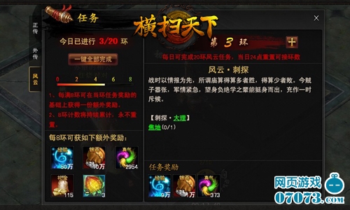 风云任务是《横扫天下》内种类最繁杂、跨地图最多的玩法,没有之一!玩家每日最多可做20环风云任务,每完成一环都有大量经验、真气和银两作为奖励。此外,每日都有随机的2环任务额外奖励神龙果,因此只有做完20环任务的玩家才能视这神龙果视为囊中之物。