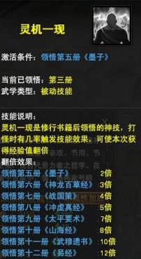 修行共分为12册:道德经、扁鹊心书、奇门遁甲、金刚经、墨子、神农本草经、战国策、冲虚真经、太平要术、山海经、武穆遗书、易经。从领悟第五册《墨子》开始打怪是会有几率触发“灵机一现”技能,该技能可获得经验翻倍的效果哦!随着修炼级别越高,经验翻倍倍数随之增加。