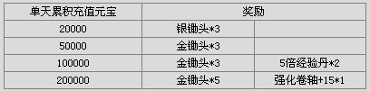 【活动内容】:在活动期间内,单日累积充值满一定元宝,即可获得奖励。