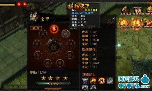 熔合后的金鳞甲片,就可以镶嵌在宝甲之上了,用以提升宝甲基础属性。每达到一定等级便可激活相应的镶嵌槽位,属性增益数值与所需材料数量都成正增长趋势。