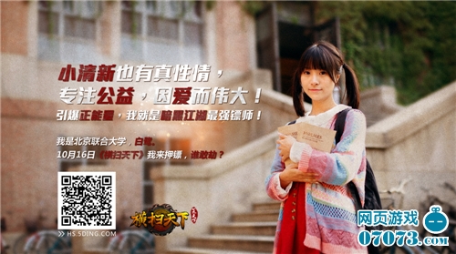 今年四月中旬,趣游新品发布会上,来自北京联合大学的白鹭初次与“横扫”结缘,COS游戏中粉靥娇腮的镰女。白鹭表面看似淡泊平静,而内心世界多姿多彩。她爱心满溢,专注公益,终将引爆正能量!正是这样的特质,让她此次再度携手“横扫”,化身“校花镖师”,肆意驰骋暗黑江湖。