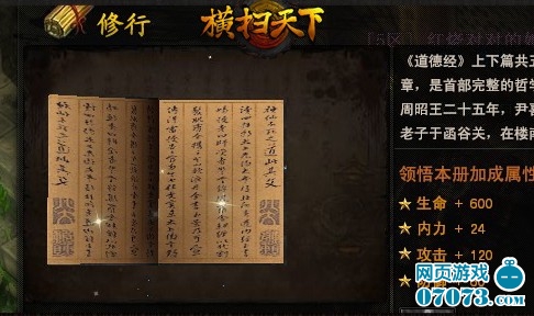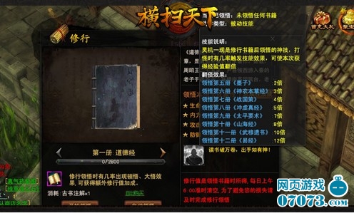 修行系统共包含12册经典典籍,共有道德经、扁鹊心书、奇门遁甲、金刚经、墨子、神农本草经、战国策、冲虚真经、太平要术、山海经、武穆遗书、易经。领悟到第五册《墨子》开始,打怪将有几率触发“灵机一现”技能,该技能可使打怪获得经验翻倍,并有不菲的属性加成!随着领悟书籍增加,经验翻倍效果也随之增加。