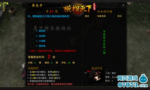 岑夫子答题活动,一直是江湖人茶余饭后的热点话题,交流经验,追寻答案,一股热烈的崇文氛围,点燃各位玩家爱好文学的心。每日19:00岑夫子答题活动准时开启。每天40道试题,每题需在10秒内完成作答;答对得积分,答错不扣分,答对越快积分越高。答题结束后榜单立时揭晓,并全服公告三甲名单,供江湖中人学习。