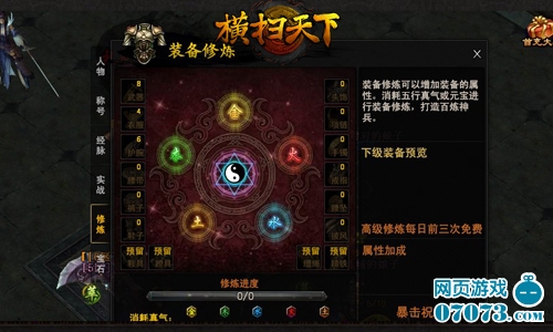 内炼身心,不仅是从人物角色身上找寻提升的方法,在与人物角色息息相关的装备上找寻提升的方法,也是一种很好的途径。装备修炼,可提升装备的不同基础属性,修炼需消耗五行真气,如果没有足够的五行真气,玩家也可以通过“高级修炼”直接进行修炼操作。