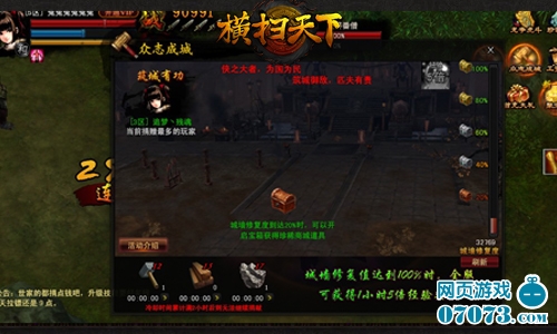 蒙古大军围攻襄阳多年,在城内军民以及武林群雄的顽强抵抗之下依然屹立至今。但在多年的战火洗礼之下,襄阳城城墙早已损毁严重,如不及时修复恐难再抵御蒙古大军的猛烈攻势。但战乱多年城内人力物力早已极度匮乏,而朝廷的物资却迟迟不到,万分危机之际,大批武林豪杰积极捐助,人力物资源源不断的运至襄阳,并在众人齐心协力之下,很快的修复好了破损的城墙,使襄阳城得以保全。这就是《横扫天下》的“众志成城”玩法。
