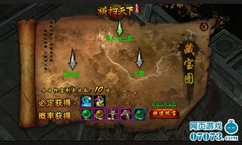 行走江湖,游历山川,偶然拾得绘工精细的地势图,仔细端详,方可发现其中暗藏玄机!珍宝道具、仙丹灵药,也有可能触怒潜伏暗处的邪魔鬼怪。当然,藏宝图也有“稀有、奇珍、传世”品级之分,在何居奇处,花费少数银两便可兑换。