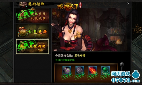 每日奖励,其一,每日使用微端登陆的玩家,都会获得礼金奖励,直接领取;其二,红衣佳人,媚态尽显,达到一定在线时长就可以摇奖,每日四次,好礼连番。