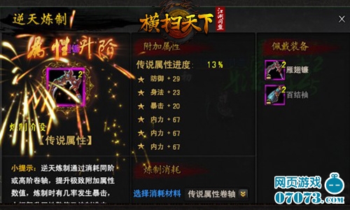 “装备逆天炼制”,将极致属性的装备再次提升到一个全新的层次,实现装备完美进阶。逆天炼制,将开启装备新的提升功能,提升后的装备共分为完美、无双、传说、真武、神威五个阶段。大侠需通过使用对应阶段的卷轴来触发功能界面。