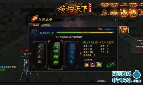 威望系统是玩家在江湖中塑造个人身份地位的养成玩法。共分为无名小辈、武林新秀、江湖侠士、自成一派、名震江湖、一代宗师六种威望等级。每实现一种威望,不但可领取超豪华道具奖励,还可获得永久属性加成。新资料片中,威望任务将得到大幅度的调整,调整后的威望任务更丰富,奖励更丰厚。