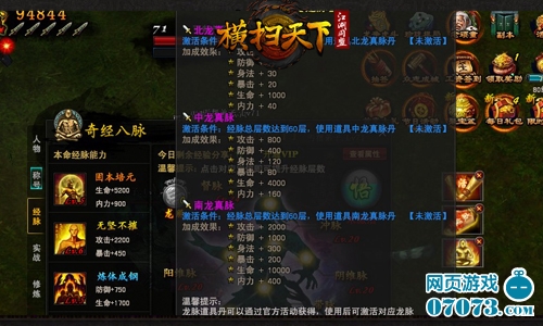龙脉系统位于人物系统的奇经八脉中,在完成修炼奇经八脉的基础上,玩家要满足一定的条件方能激活龙脉系统。当玩家的经脉总层数达到60层时,玩家可使用相应的真脉丹,激活三条龙脉。使用北龙真脉丹激活北龙真脉;使用中龙真脉丹激活中龙真脉;使用南龙真脉丹可激活南龙真脉。