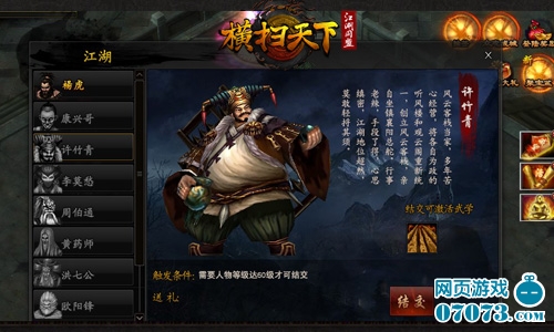 “江湖侠客”系统,结交江湖侠客,缔交盟约,并肩作战,同闯江湖。江湖系统,现已开放杨虎、康兴哥、许竹青三位侠客的结交,玩家与之结交,不仅在战场上得到一个有力的帮手,还能获得额外的属性加成。级别高的玩家,可越过前两位侠客,直接结交第三位侠客——许竹青,其战力与属性加成都是现版本中最高的,许竹青的结交条件是人物等级达到60级。想必老玩家都是轻而易举就能达成这个结交条件的吧!结交江湖侠客,并肩力战暗黑江湖!