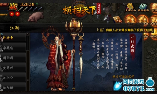 洪七公,“棒打狗头”,丐帮帮主,曾因贪吃误事自断右手食指,故称“九指神丐”,率性而为,宽厚仁侠。其绝学使用后,可攻击近距离单体目标,并有几率无视目标防御。