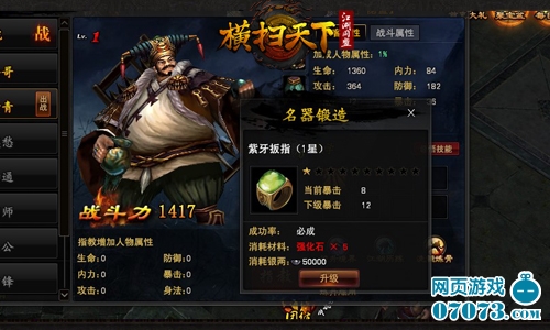 “名器锻造”,每个侠客有4件名器,对应增加侠客身上不同的属性,升级名器,即可提升侠客的基础属性。当名器满足一定等阶后,即可激活额外的名器套装属性。