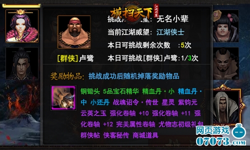 每天可以进行9次群侠挑战,每个群侠最多挑战3次,也可以用“斗神令”增加挑战次数,每天6:00刷新。虽然,开放的五位群侠并非江湖名宿,却着实让众位玩家叫苦连天。不过,挑战失败也不必灰心,可以得到经验、真气值积累,以备日后卷土重来!实力玩家如果挑战成功,可以获得“云英之玉、+12完美卷轴、侠客秘传”等颇为诱人奖励!