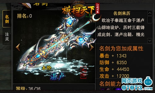 九阶湛卢,欧治子奉越王命于湛卢山辟地设炉,历时三载铸成此剑。湛卢出鞘,精光贯天,日月争耀,星斗避彩,鬼神悲号。从此,欧治子就同他的湛卢剑一起名扬天下。湛卢剑属性包括:暴击+1343、防御+6350、生命+44450、攻击+12700。