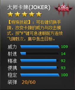 武器描述:全新五星主武器“大师卡牌”携手一***寒假专属特惠活动强势登陆《火线精英》!武器拥有两种攻击模式和形态,可用鼠标右键随意切换~同时,在全模式中,按“F”键即可使用攻击技能急速攻击目标~达到克敌制胜的效果!不用说,一朝卡牌在手,大师气场全开,霸气十足