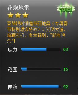 武器描述:全新地节限定款地雷,以春节期间必备过节道具花炮为设计灵感,独享专属爆炸特效。让你在节日里无论能否放花炮都能感受到十足年味!
