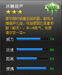 武器描述:春节限定近战武器本次更新后公开贩售!玩家将可以在商城以金币和点卷两种方式购买~快来体验下酸酸甜甜的糖葫芦吧~这酸爽!一定不会让你失望!