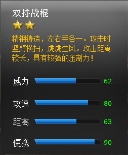 武器描述:火热盛夏,火热盛宴——新的二星近战武器,双持战棍来了!攻击距离较远,具有较强的压制力!