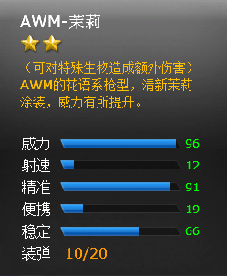 武器描述:(可对特殊生物造成额外伤害)AWM的花语系枪型,清新茉莉涂装,威力有所提升。