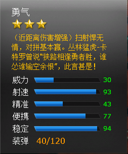 武器描述:(近距离伤害增强)扫射悍无情,对拼基本赢。丛林猛虎-卡特罗曾说“狭路相逢勇者胜,谁怂谁输空余恨”,此言甚是!