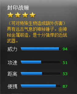武器描述:(可对特殊生物造成额外伤害)具有远古气息的神秘锤子。由神秘金属锻造,是十分强悍的近战武器。