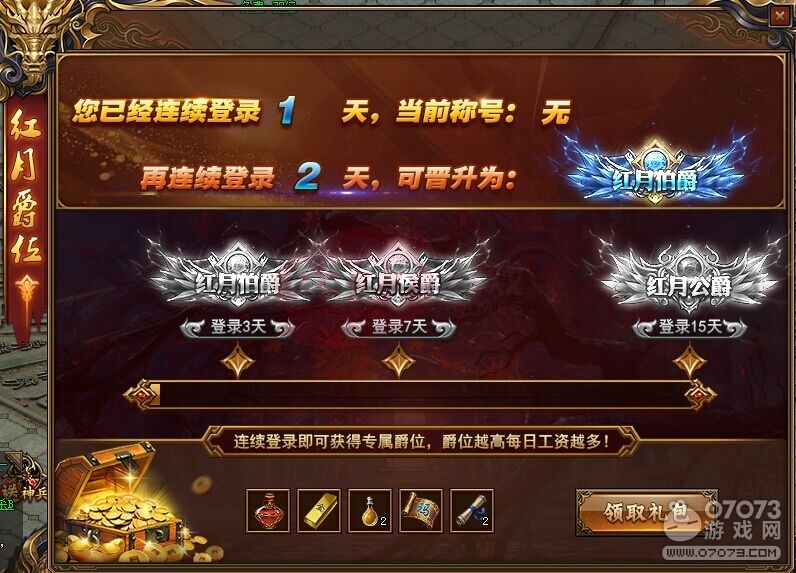 连续登录3日晋升为红月伯爵。红月伯爵能带来魔法攻击50-100、物理攻击50-100以及道术攻击50-100。红月伯爵每日奖励强效攻击药水*1、金条*2、祝福油*3、玛雅令牌*1、副本卷轴*3。