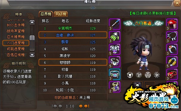 为了获得更高的能力,《火影世界》的玩家潜心修炼查克拉精华,打通八门各穴位,都想尽快八门全开,获得最大的八门属性加成。为了鼓励和表彰这些努力的玩家,游戏中设有八门进度排行,努力修炼八门的玩家除了体验着八门激发出的巨大潜力,同时也尽享其他玩家的羡慕和敬仰。