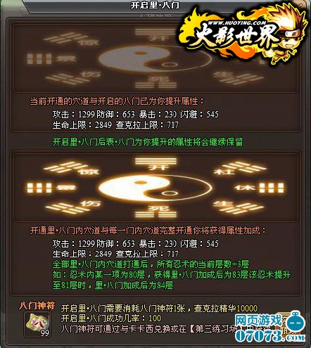 火影之路艰难而又漫长,不要以为打通八门,就在忍术方面登峰造极了哦!玩家只有不断的提升自己,突破瓶颈,才能获得更强大的力量。打通八门后,点击八门遁甲界面的“突破瓶颈”,就可以开启里·八门。全部里·八门内穴道打通后,可以获得更为吸引人的强大属性加成,并且所有忍术的当前层数都会提升3层。