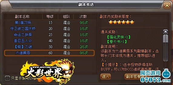 和其它副本一样,依旧是从木叶村NPC纲手处进入副本,每日一次免费进入机会。通关后还有春の书作为奖励哦!还等什么,快来和六道佩恩决一死战吧!