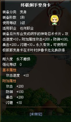 兑换比例:3张终极豚豚变身卡可以兑换1张终极纲手变身卡.