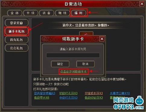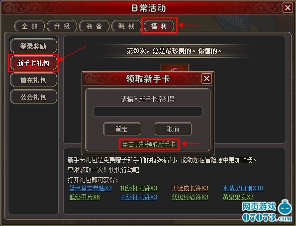 在游戏右上角点击【日常】—【福利】—【新手卡礼包】—【领取新手卡】,按照提示领取;