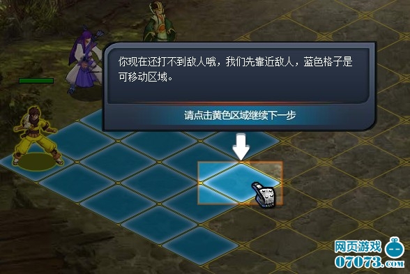 每一名角色都有一定的攻击距离。如果你暂时还打不到敌人,地图上会显示出一片蓝色的格子,这就是你可以移动的范围了。