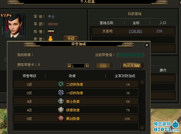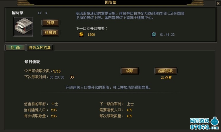 您的建筑人口越高,军衔也就越高。这将直接决定您每天获得功勋的量,以及可以使用的军官数量。