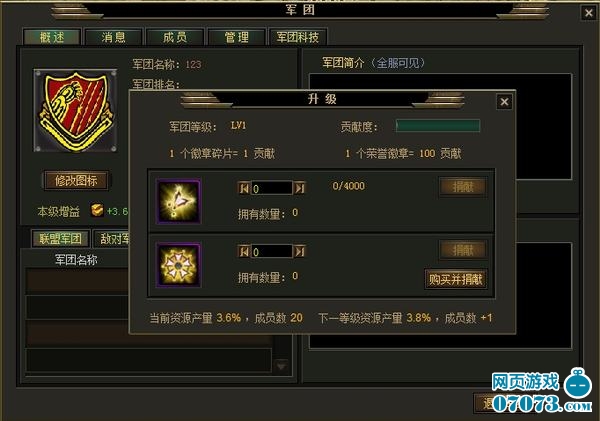 2. 军团成员可以通过捐献荣誉徽章和徽章碎片提升军团等级,军团等级越高带来的加成效果和成员数上限也越高,军团最高可以升级到30级。