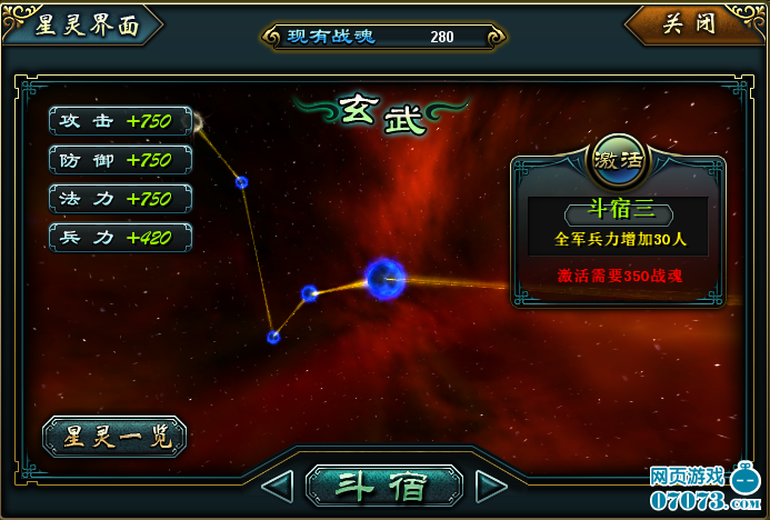 将神在征战或挑战中获胜后会获得战魂,战魂积累到一定数量就能够点亮天空中一个星宿,从而获得星之灵力,强化你全军的能力。