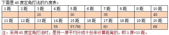 基本公式:角度45固定,力度=屏距力度+/-风力 (顺风-力度,逆风+力度)