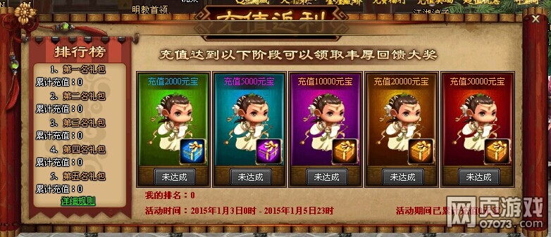 活动内容 :只要充值满2000、5000、10000和20000元宝,就能分别获得额外赠送的精美返利礼包、豪华返利礼包、至尊返利礼包和无双返利礼包,另外添加50000元宝大礼包。礼包内含有神秘大礼。走过路过不能错过哦!