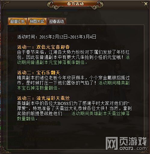 活动期间,开启三大福利活动双倍元宝喜迎春、宝石乐翻天、流光溢彩天蚕丝~~~