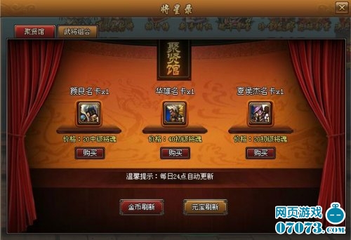 聚贤馆提供了我们目前可以买到的武将卡片,当然刷新和购买都是需要元宝的。