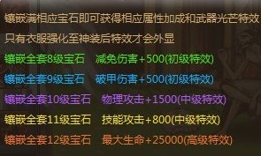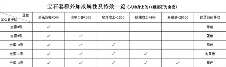 注意:这里的全套宝石等级划分,是按照人物身上的14颗宝石里等级最低的那颗来计算的,也就是只要你还有7级宝石,就算其余13颗宝石全是12级了,你也不能激活8级宝石套的额外属性。