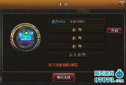 所有神策初始只有一条属性可以进行洗炼,点击开启按钮消耗元宝可开启新的可洗炼属性。
