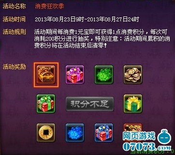 活动内容:活动期间每消费1元宝即可获得1点消费积分,每次消耗200积分进行抽奖,奖品包含有宝石碎片宝箱、幸运草礼包、丹药礼包等大礼。