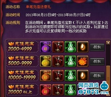 活动内容:玩家在活动期间单笔充值达到一定元宝,即可在精彩活动面板领取相应奖励。