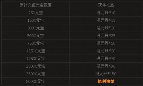 活动内容:玩家在活动期间单笔充值达到一定元宝,即可在精彩活动面板领取相应奖励。