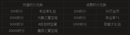 活动内容:玩家在活动期间充值元宝可获得充值积分,消费元宝可获得消费积分,使用充值积分和消费积分可兑换大量超值奖励。