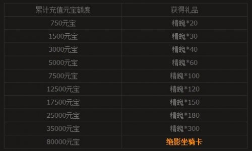 活动内容:玩家在活动期间单笔充值达到一定元宝,即可在精彩活动面板领取相应奖励。