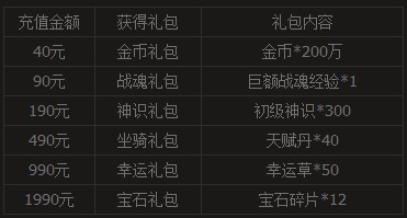 2、累计充值达一定金额,玩家可领取满足条件的所有礼包1次。例如小明活动期间充值了490元,那么他可以获得金币礼包+战魂礼包+神识礼包+坐骑礼包。
